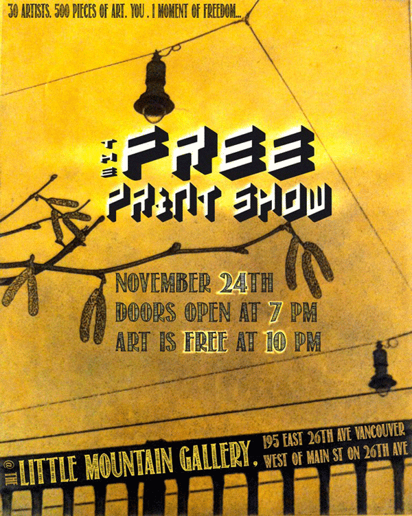 | FREE PRINT SHOW! November 24th, 2012 - Little Mountain Gallery, Vancouver, BC The FREE Print Show: an exercise in freetility The free print Show; lasts one night, deals with consumerism and the effects of the word 'free', gives away 500+ unique prints free too all. All donations go to the Portland Hotel Society ----------------------------------------------------------------------------- |